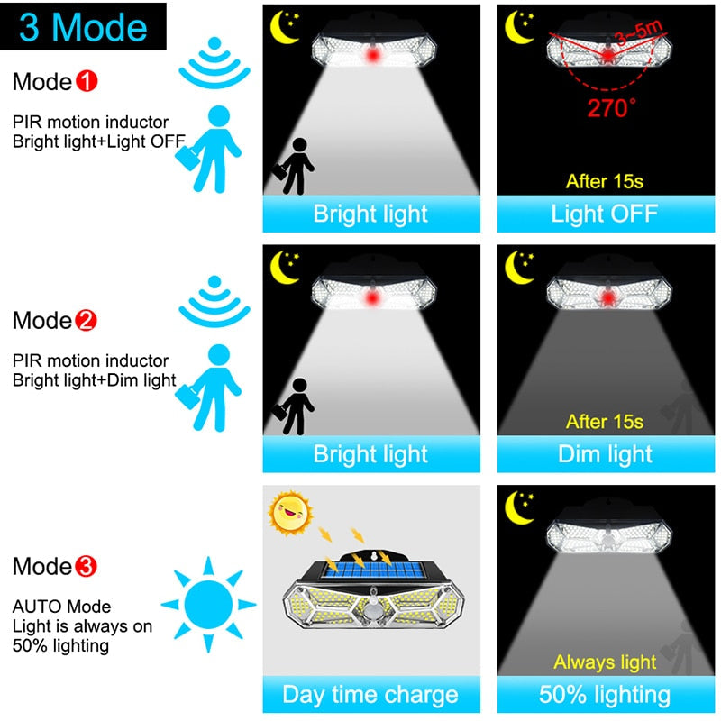 Grace à cette lampe solaire super lumineuse vous dépenserez plus votre argent pour éclairer votre jardin ! Dotée de 126 LEDs et différentes surfaces électroluminescentes qui couvre 270°, cette lampe solaire d'extérieur peut fournir 10 fois plus de luminosité que d'autres lampes solaires. Son détecteur de mouvement à un angle de 120 ° lui permet de localiser le mouvement à une distance de 7 mètres.