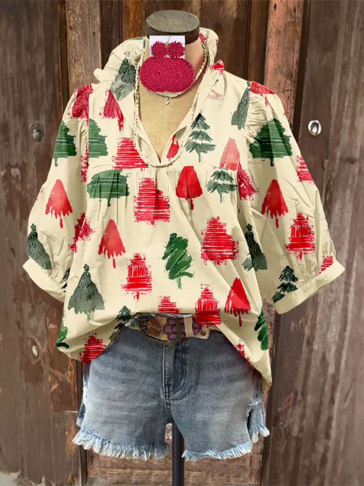 Révélez votre style festif avec le Chemisier Motif Sapin de Noël Manches Bouffantes. Commandez maintenant pour une touche élégante et joyeuse à votre garde-robe de fête! 🛍️❤️