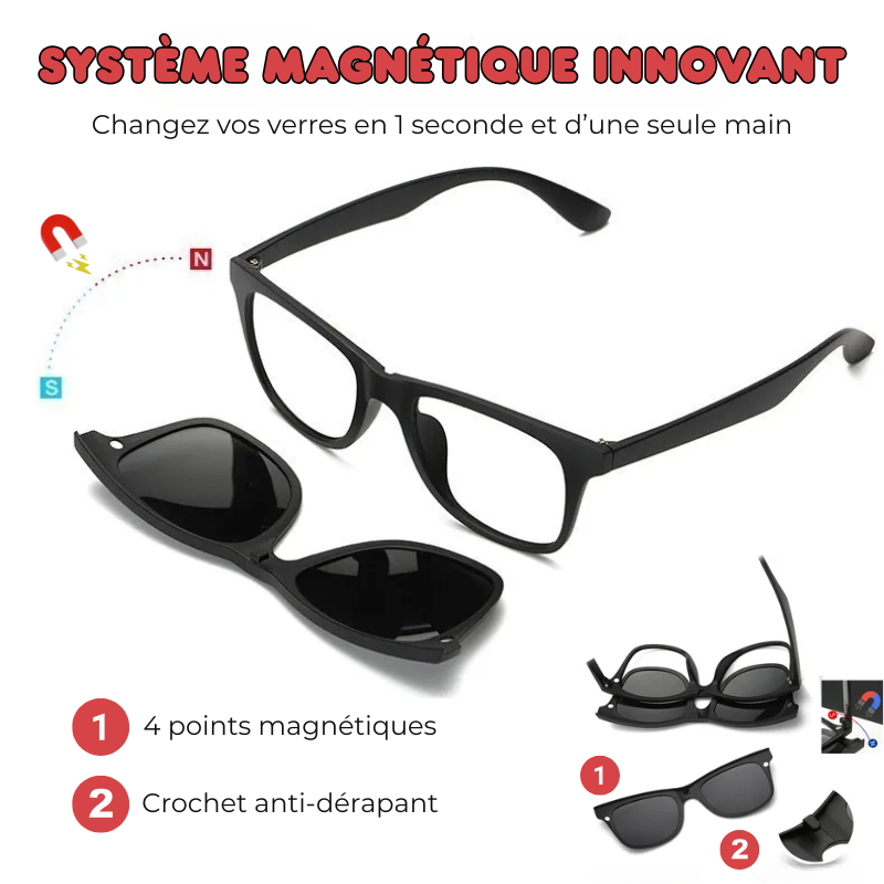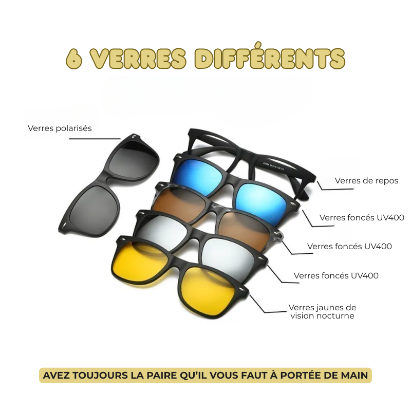Découvrez la monture de lunettes révolutionnaire qui s’adapte à toutes les situations : conduite de jour ou de nuit, sortie à la plage, randonnée ou pêche, et même au quotidien. Grâce à leur système magnétique innovant, ces lunettes 6 en 1 sont l’accessoire indispensable de votre été… et de toute l’année !