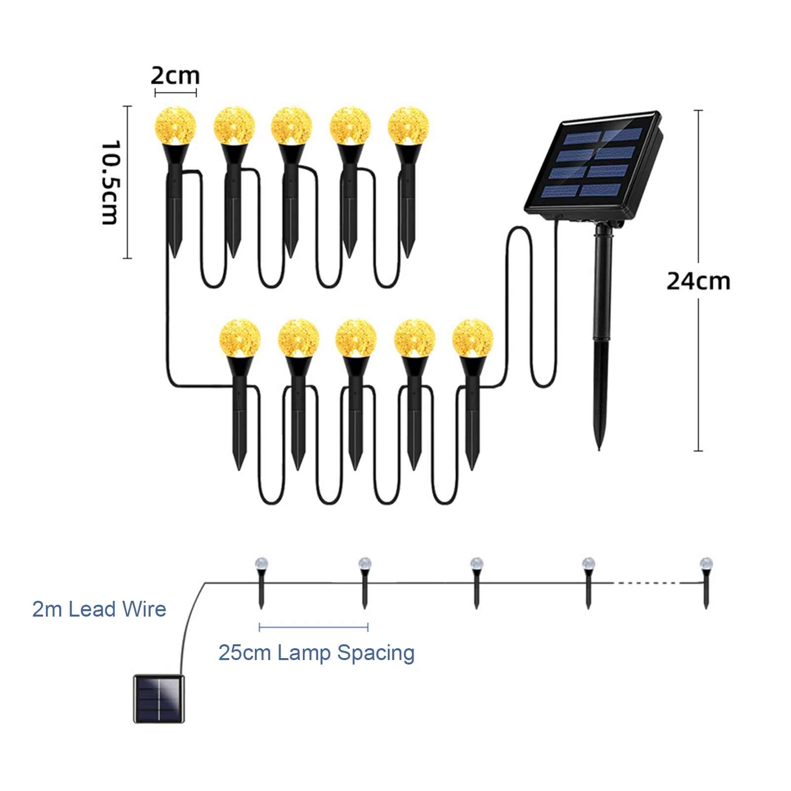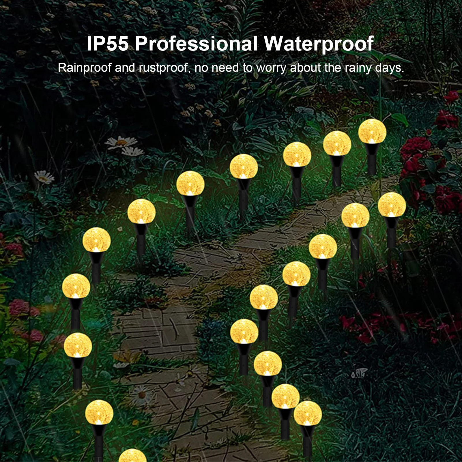 La conception étanche de grade IP65 garantit que ces lampes solaires peuvent fonctionner normalement même par temps de pluie. Installez-les en toute confiance dans votre jardin, sur le chemin, dans la cour, ou partout où vous le souhaitez. Ces lampes résistantes aux intempéries ajoutent une touche de beauté, peu importe la météo.